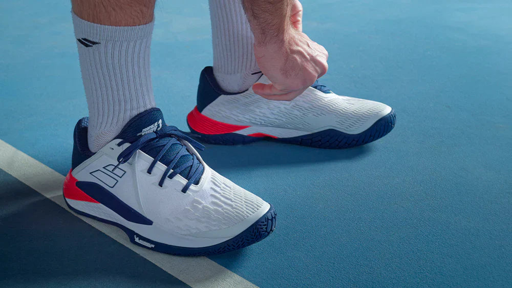 I tennis laver du mange retningsskift og sidebevægelser. Derfor skal du have en sko skabt til tennis. Tennissko har en meget stabil mellemsål og overdel, som giver støtte til din fod, hver gang du sætter den i underlaget. Derved nedsættes risikoen for, at du vrikker om. Tennissko har tillige støddæmpning de rigtige steder, så du skåner dine led. Der findes forskellige tennissko til forskellige underlag, men også én sko til dem alle: nemlig allcourt. Hvis du udelukkende spiller på grus, er der dog fornuft i at vælge en clay-sko (grus-sko), som har en fast overdel, som holder dine fødder på plads når du bevæger dig rundt på banen. Clay-skoen har også en særlig evne til både at glide let og stå fast på grus. En græs-sko skal have samme egenskaber, men kan med fordel have en mere fleksibel overdel, så dine fødder ikke føles klemt når du skal løbe efter bolden. Hardcourt kræver en støddæmpende sål på grund af det hårde underlag og en fast overdel til at holde foden stabil og undgå vrid.Beskidte sko skal rengøres med en blød børste eller med kostene, der findes ved tennisbanerne. Ligesom en badmintonsko har dine tennissko også godt af at få lov til at tørre ordentligt mellem hver træning. Op af sportstasken med dem og ud med sålerne, så de får luft og kan tørre igennem.